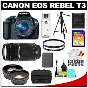 Canon EOS Rebel T3 Digital SLR Camera Body & EF-S 18-55mm IS II Lens with 75-300mm III Lens + 16GB Card + .45x Wide Angle & 2x Telephoto Lenses + Battery + (2) Filters + Tripod + Accessory Kit best price